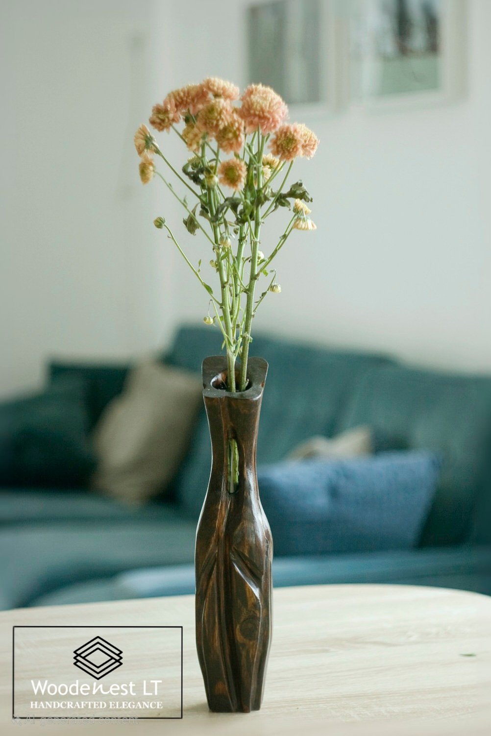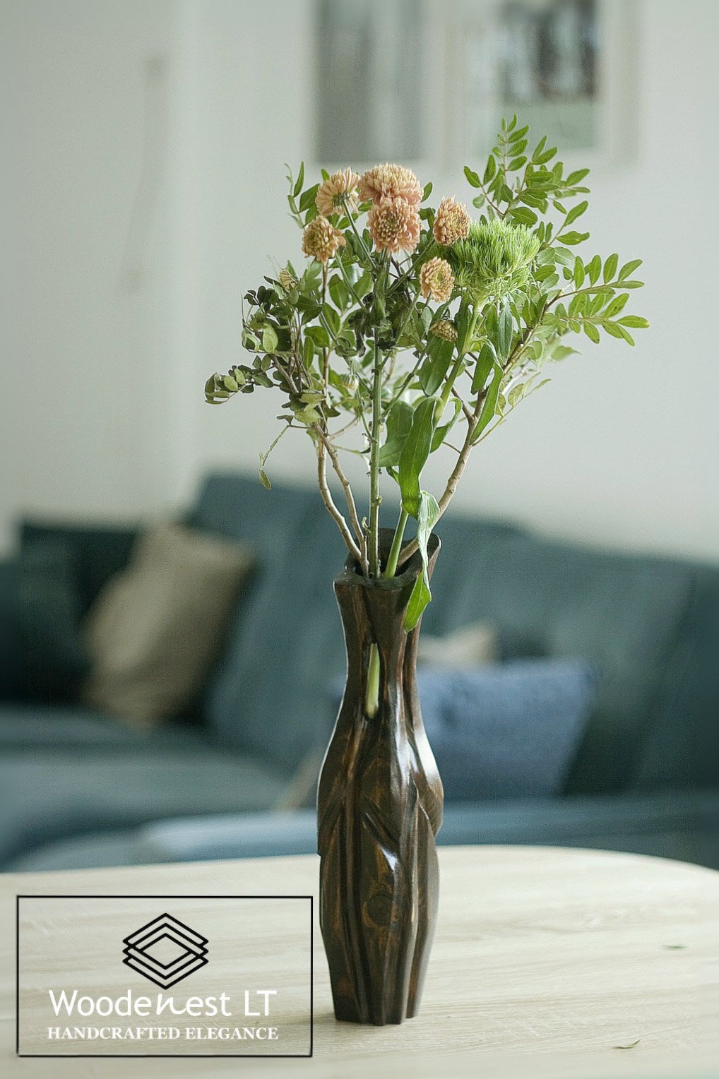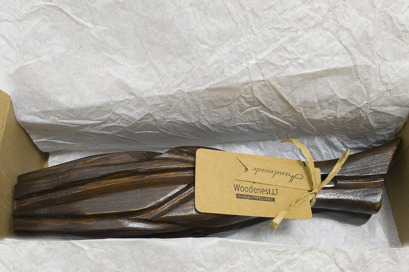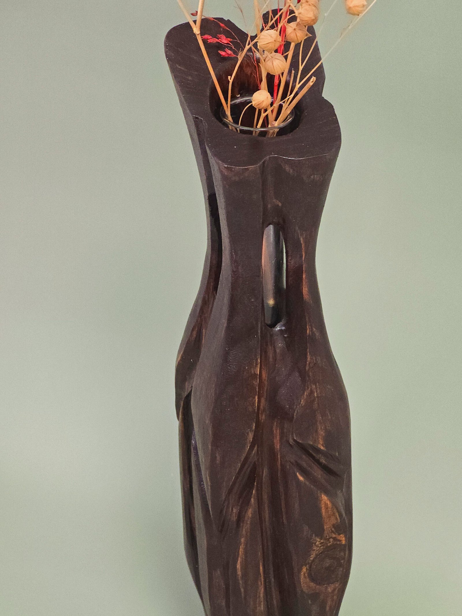 + siuntimo išlaidosRankų darbo medžio masyvo vaza su stikline kolba. Pailga, įvairių formų rieves derinanti vaza.