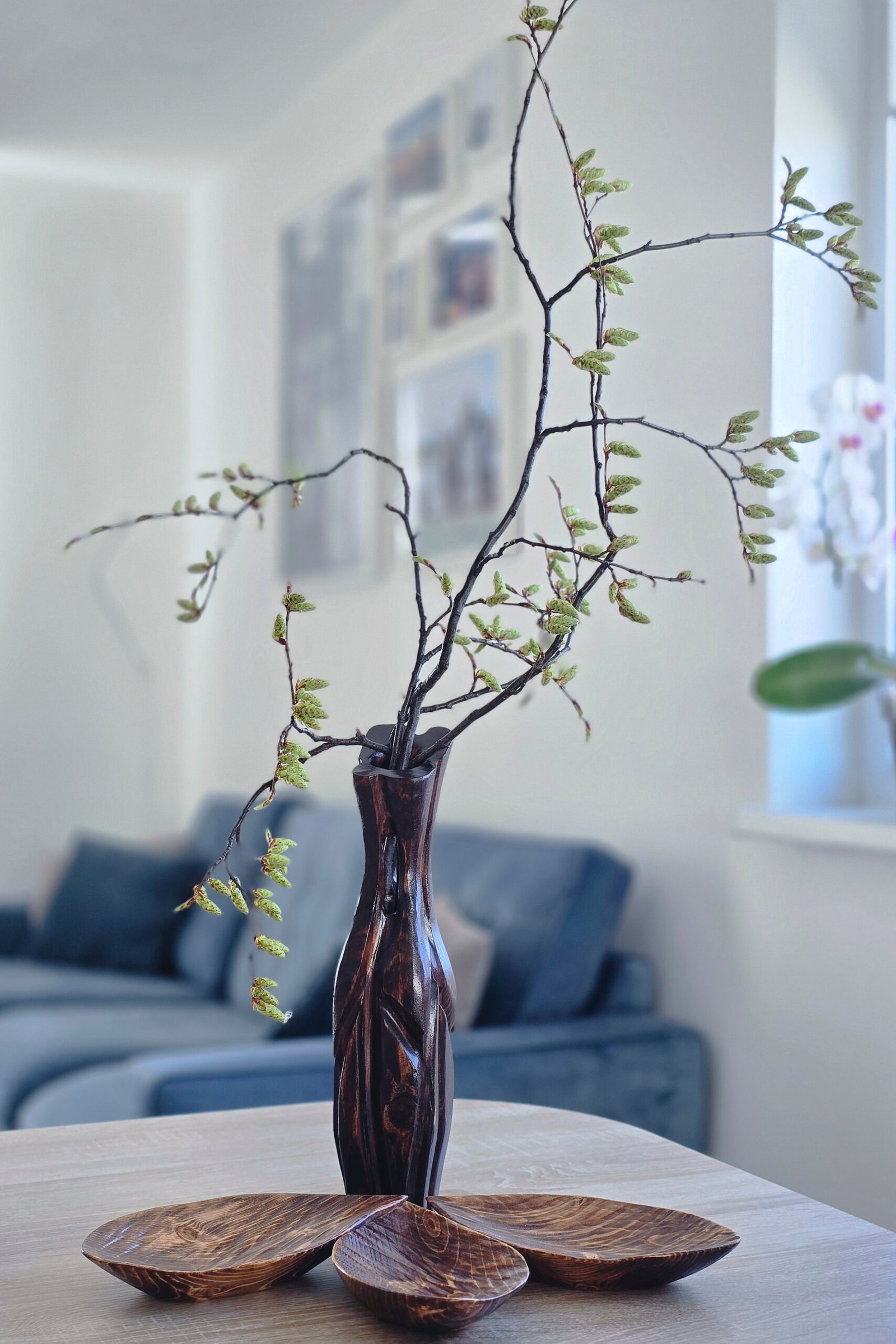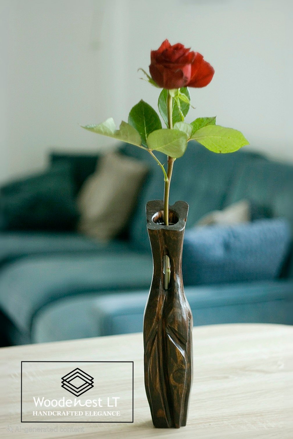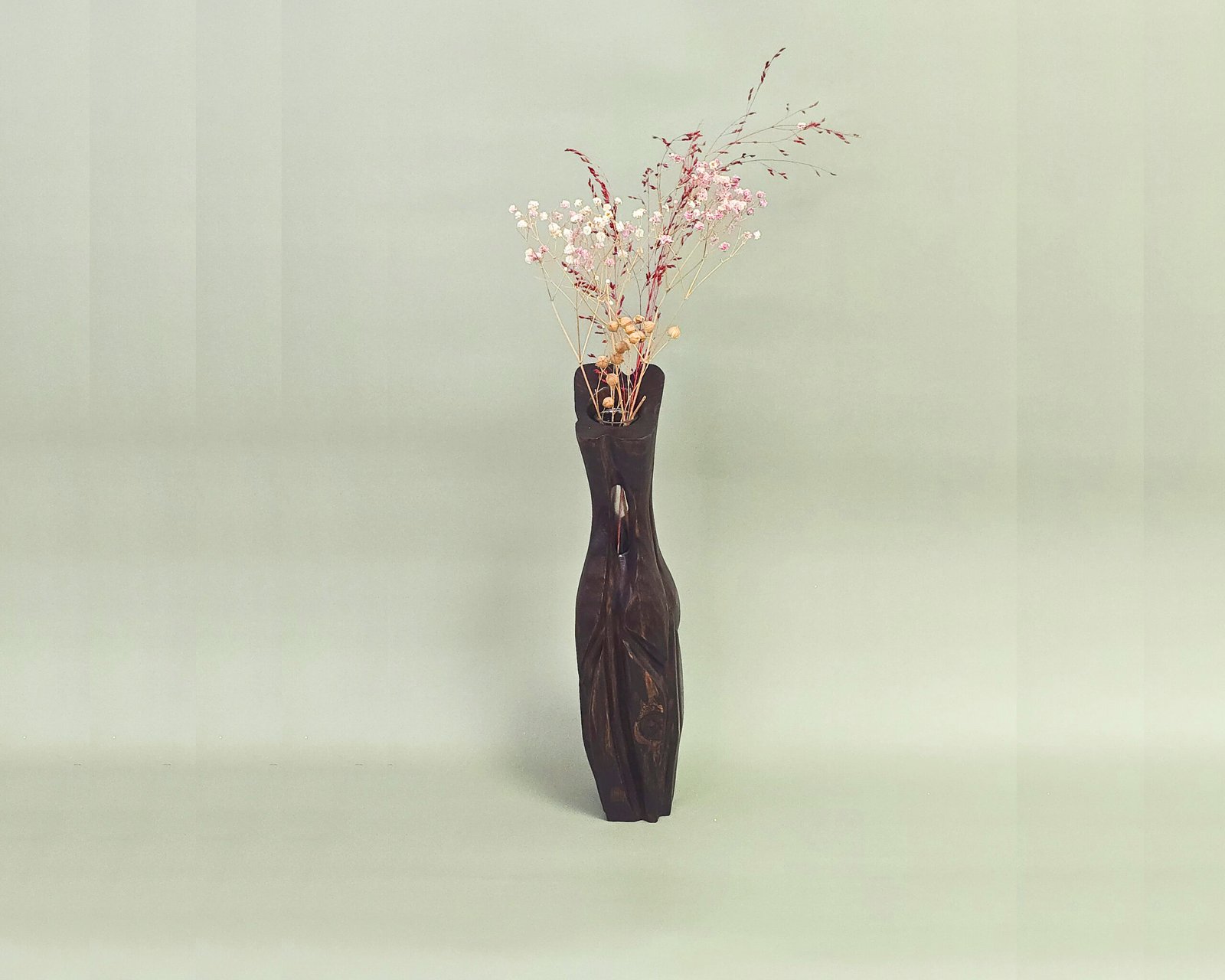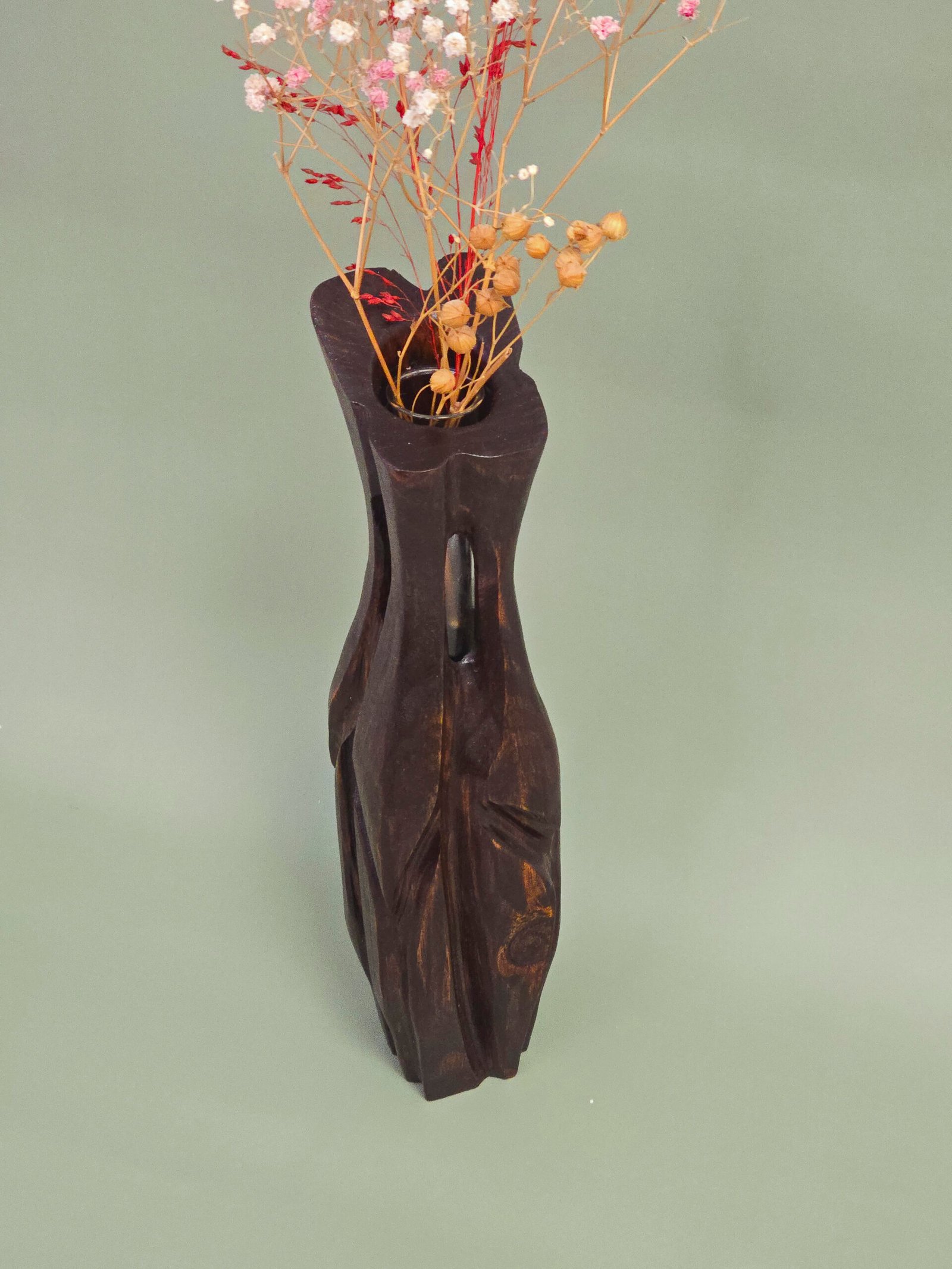 + siuntimo išlaidosRankų darbo medžio masyvo vaza su stikline kolba. Pailga, įvairių formų rieves derinanti vaza.