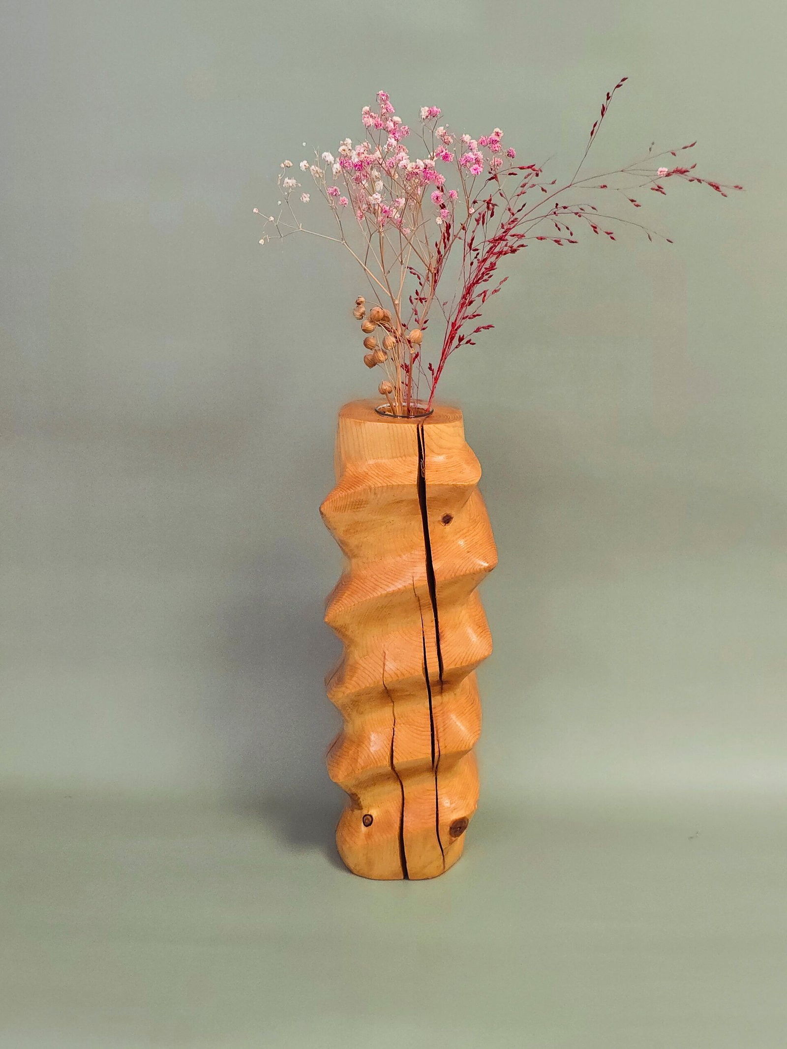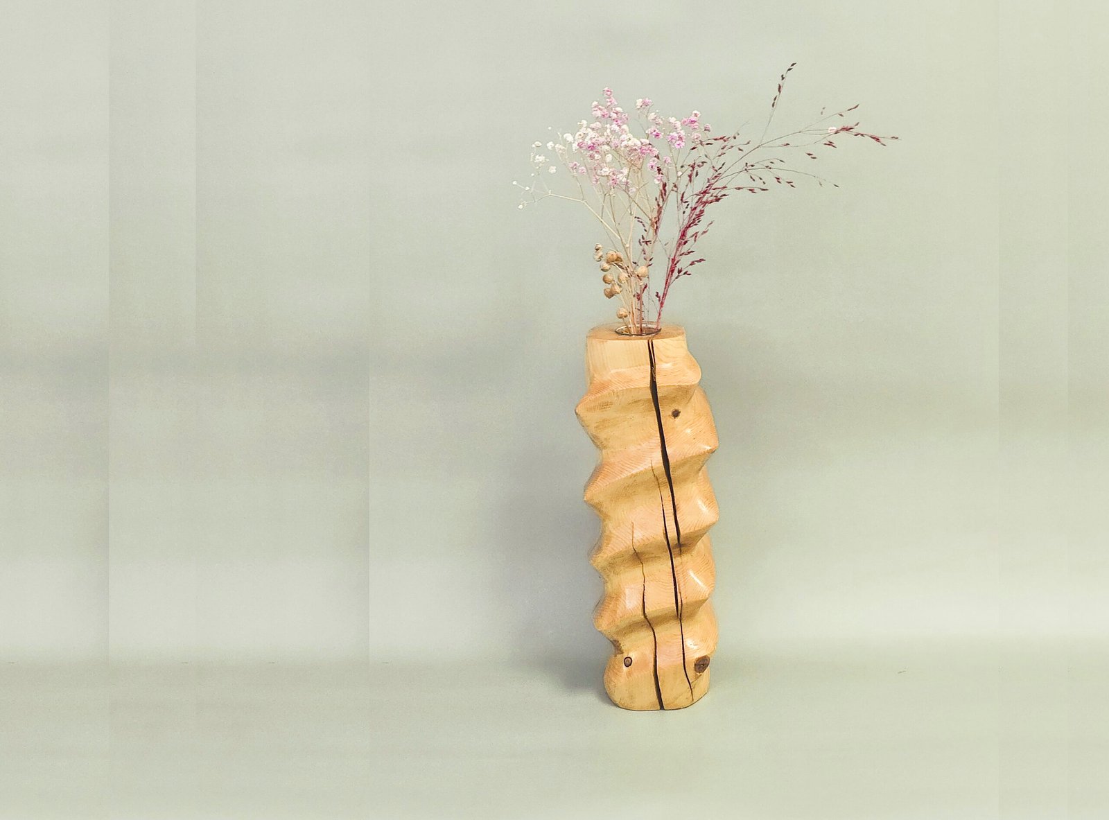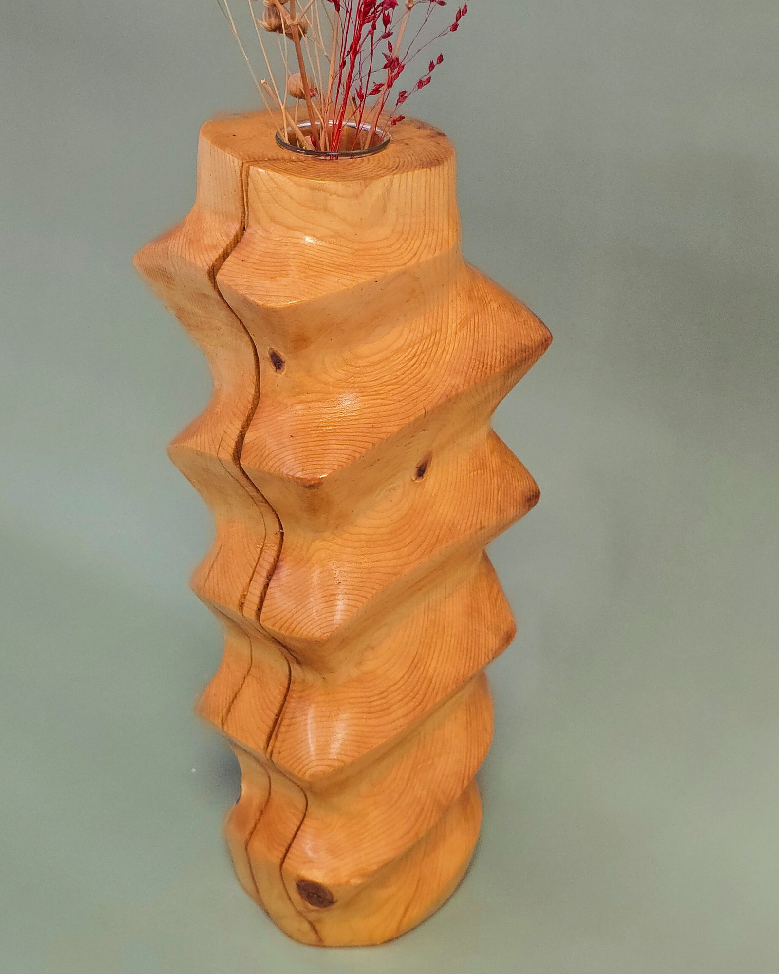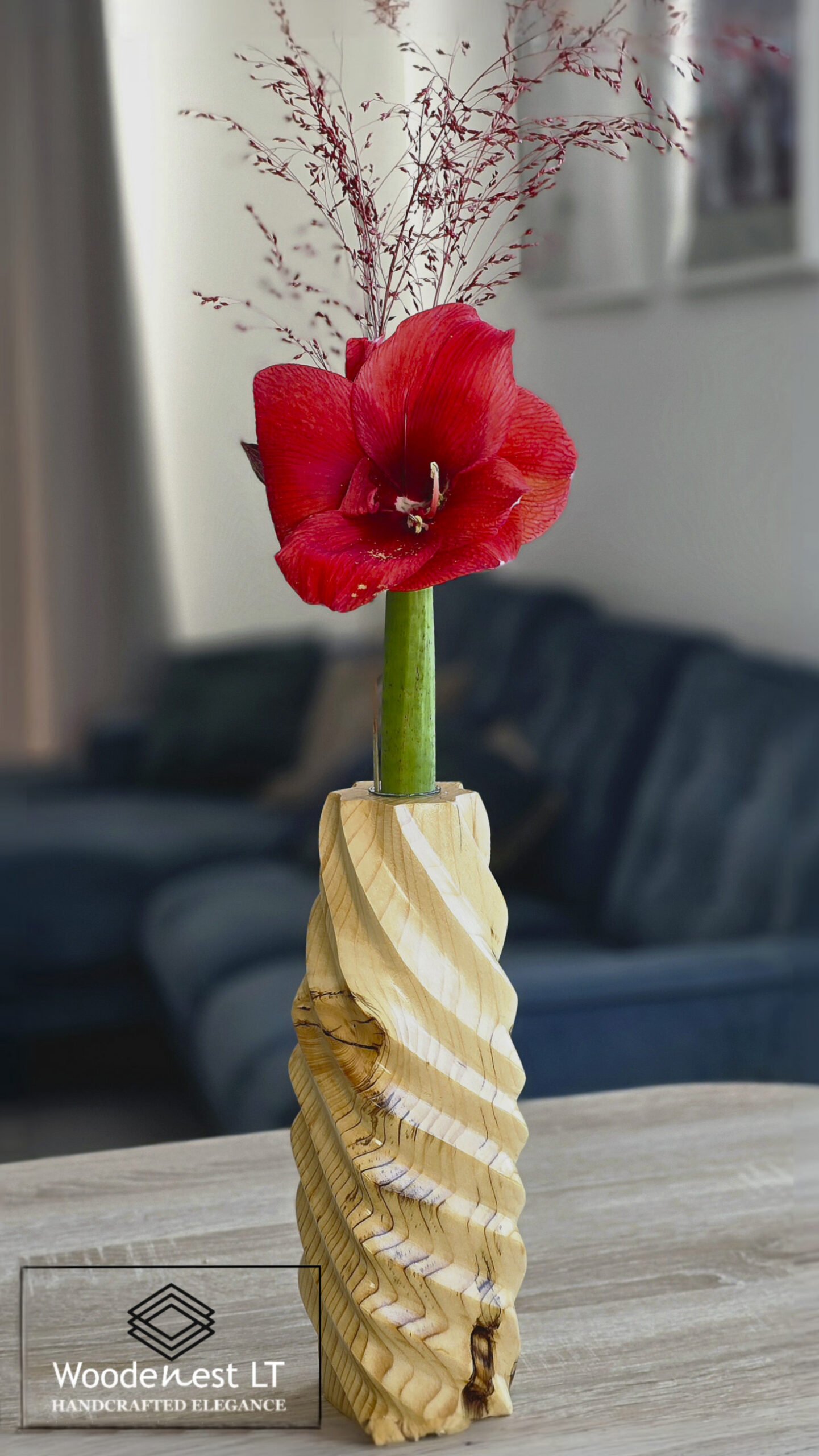 Rankų darbo medžio masyvo vaza su stikline kolba. Suktos rievės išryškina itin nuostabų medžio gijų raštą.