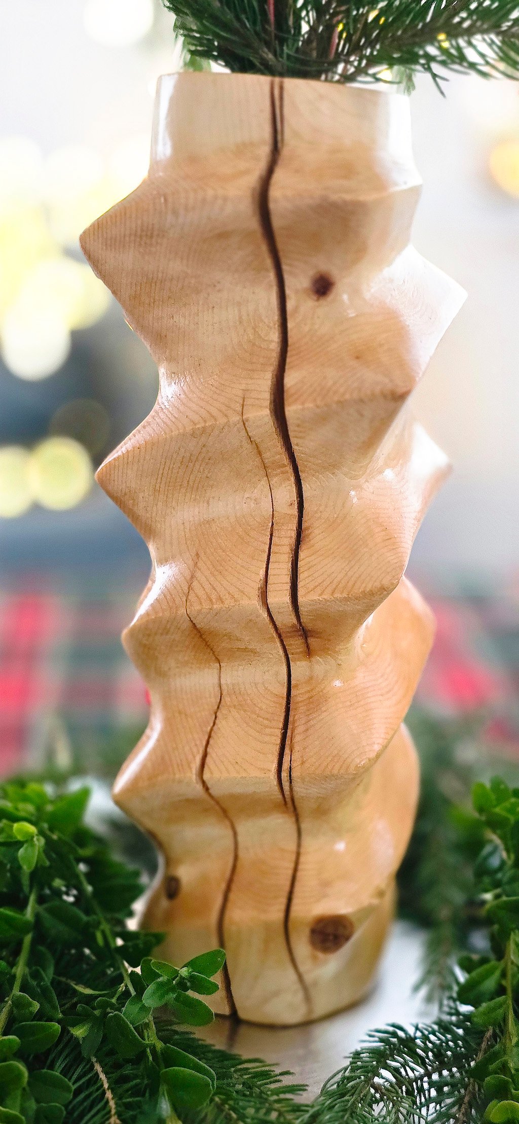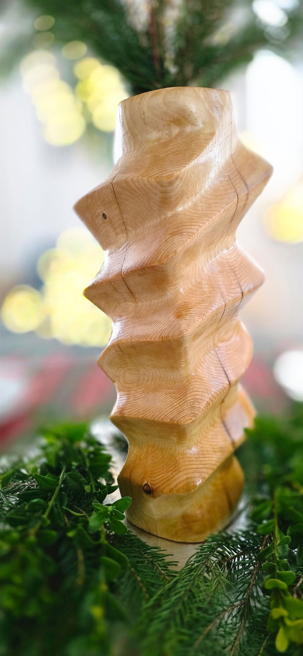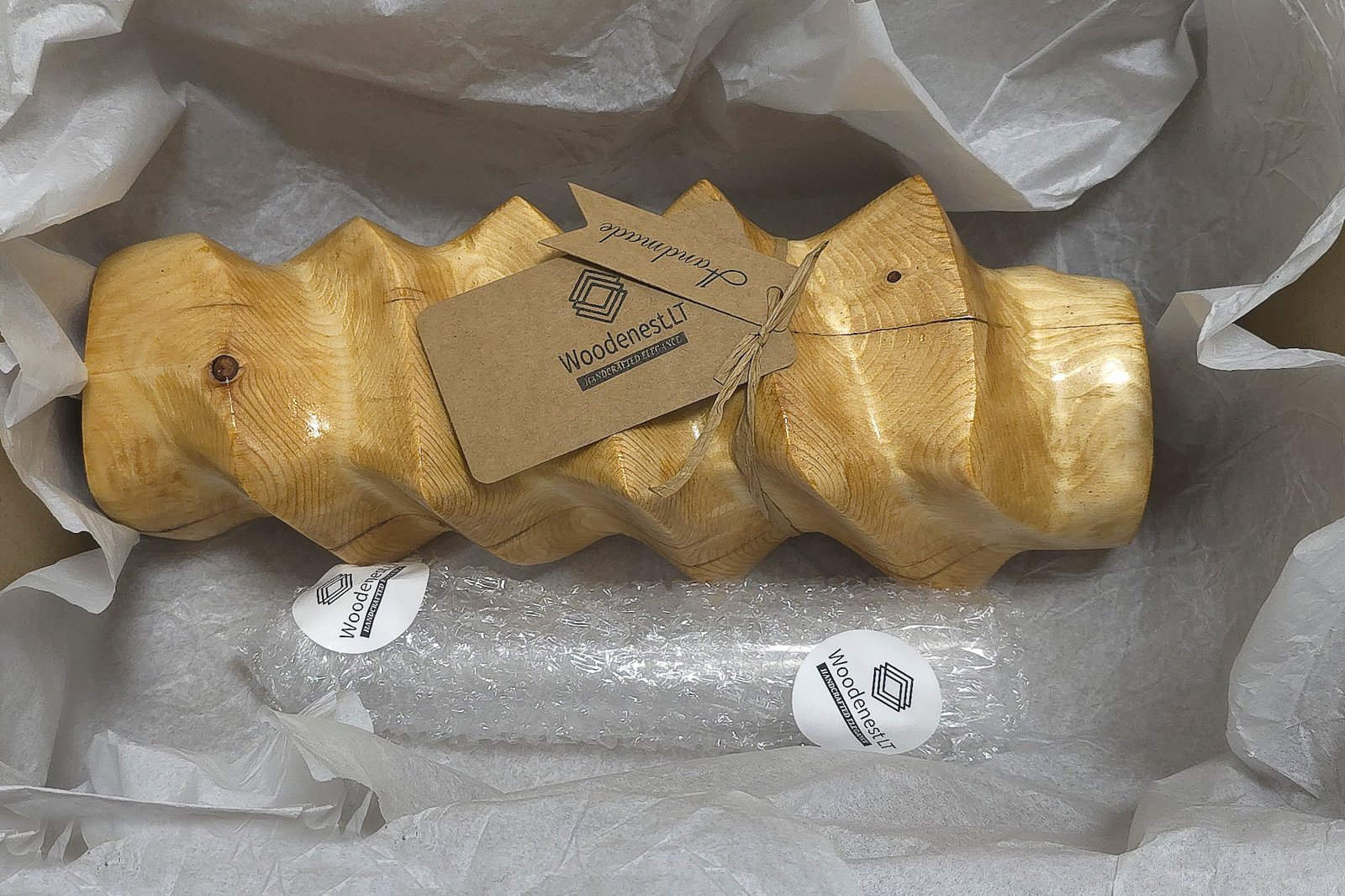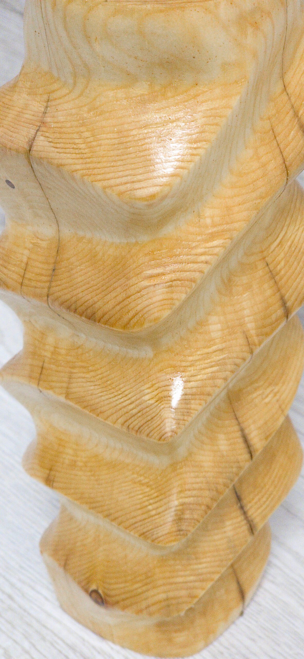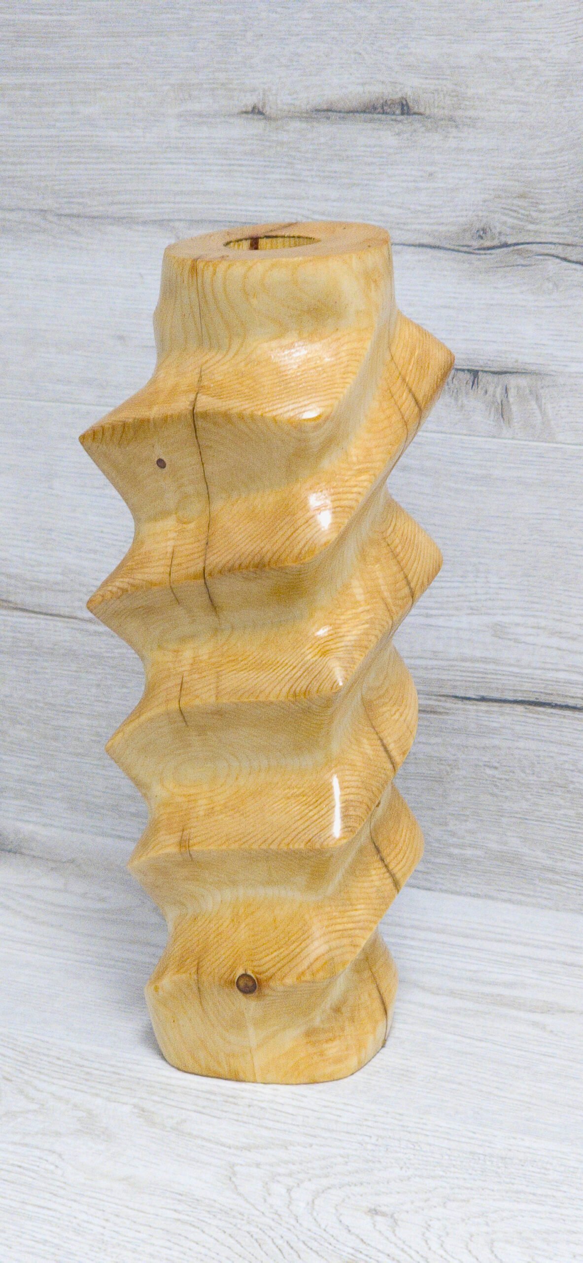 Rankų darbo medžio masyvo vaza su stikline kolba. Suktos rievės išryškina itin nuostabų medžio gijų raštą.