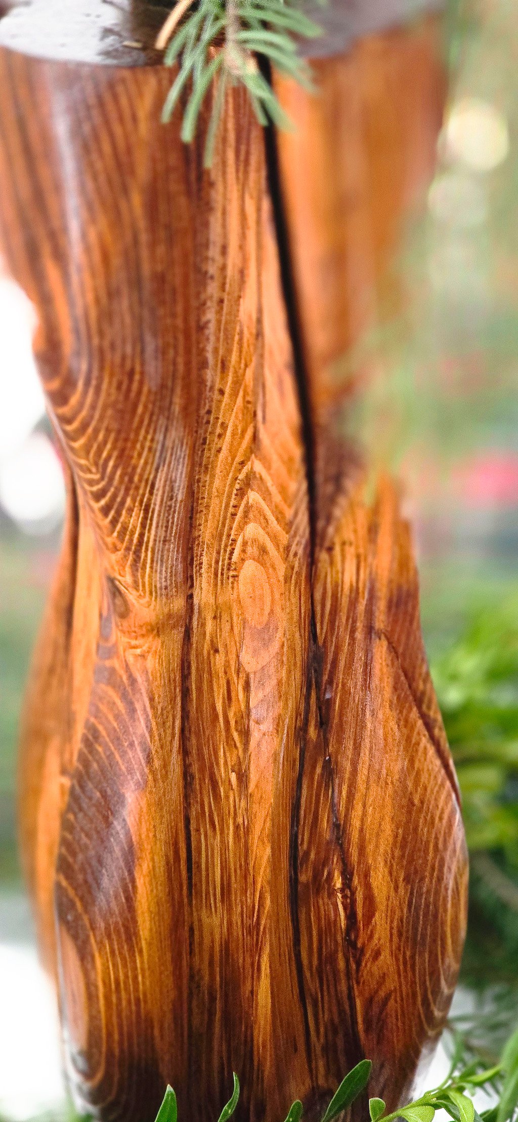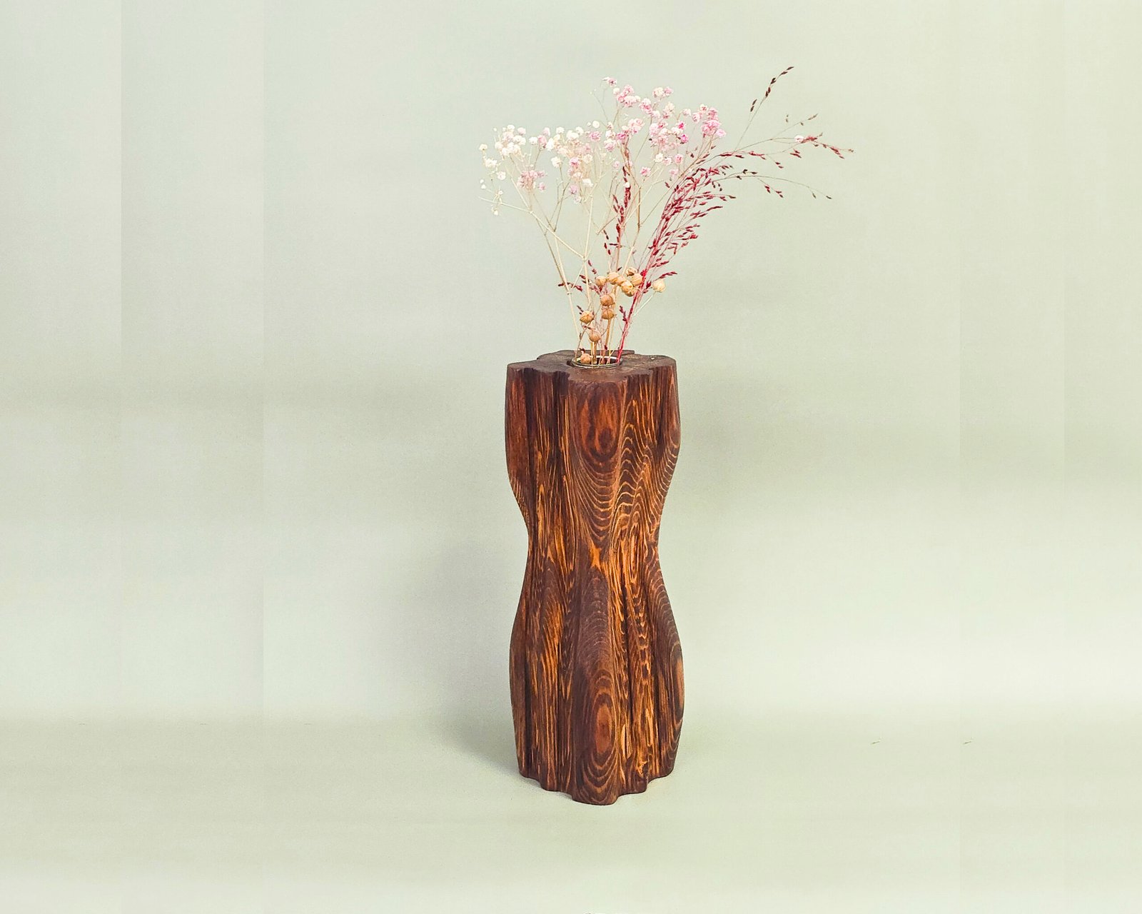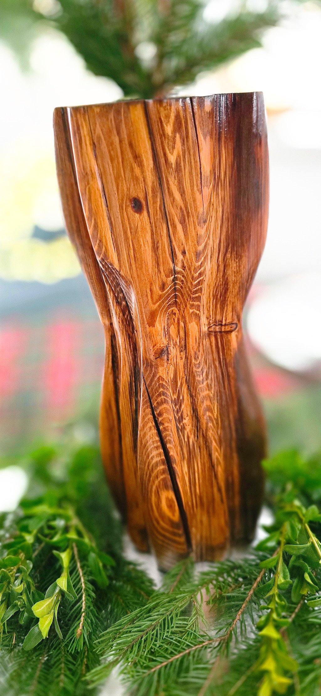 + siuntimo išlaidosRankų darbo medžio masyvo vaza su stikline kolba. Masyvi, natūralių medžio įskylimų turinti bei pailgos it smėlio laikrodis formos vaza. Smulkiai suktos rievės išryškina itin nuostabų medžio gijų raštą.