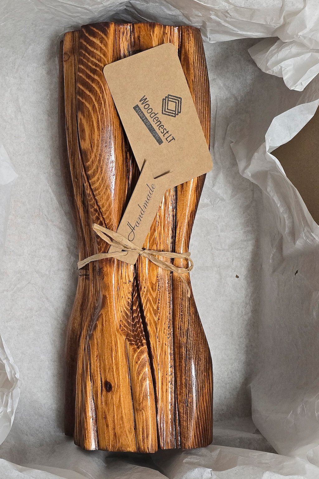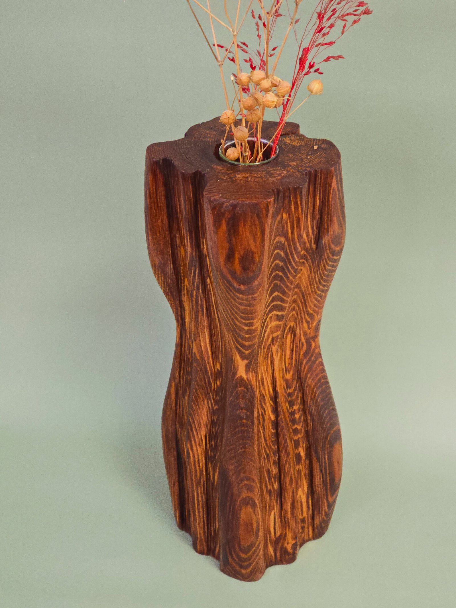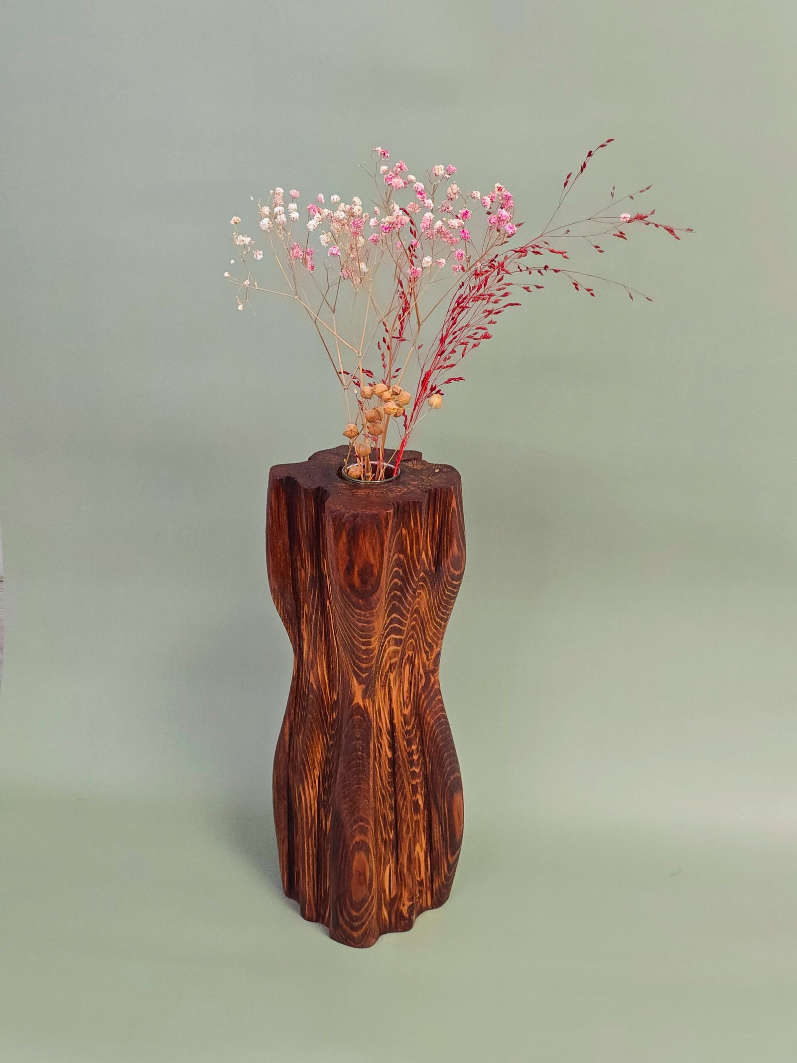 + siuntimo išlaidosRankų darbo medžio masyvo vaza su stikline kolba. Masyvi, natūralių medžio įskylimų turinti bei pailgos it smėlio laikrodis formos vaza. Smulkiai suktos rievės išryškina itin nuostabų medžio gijų raštą.