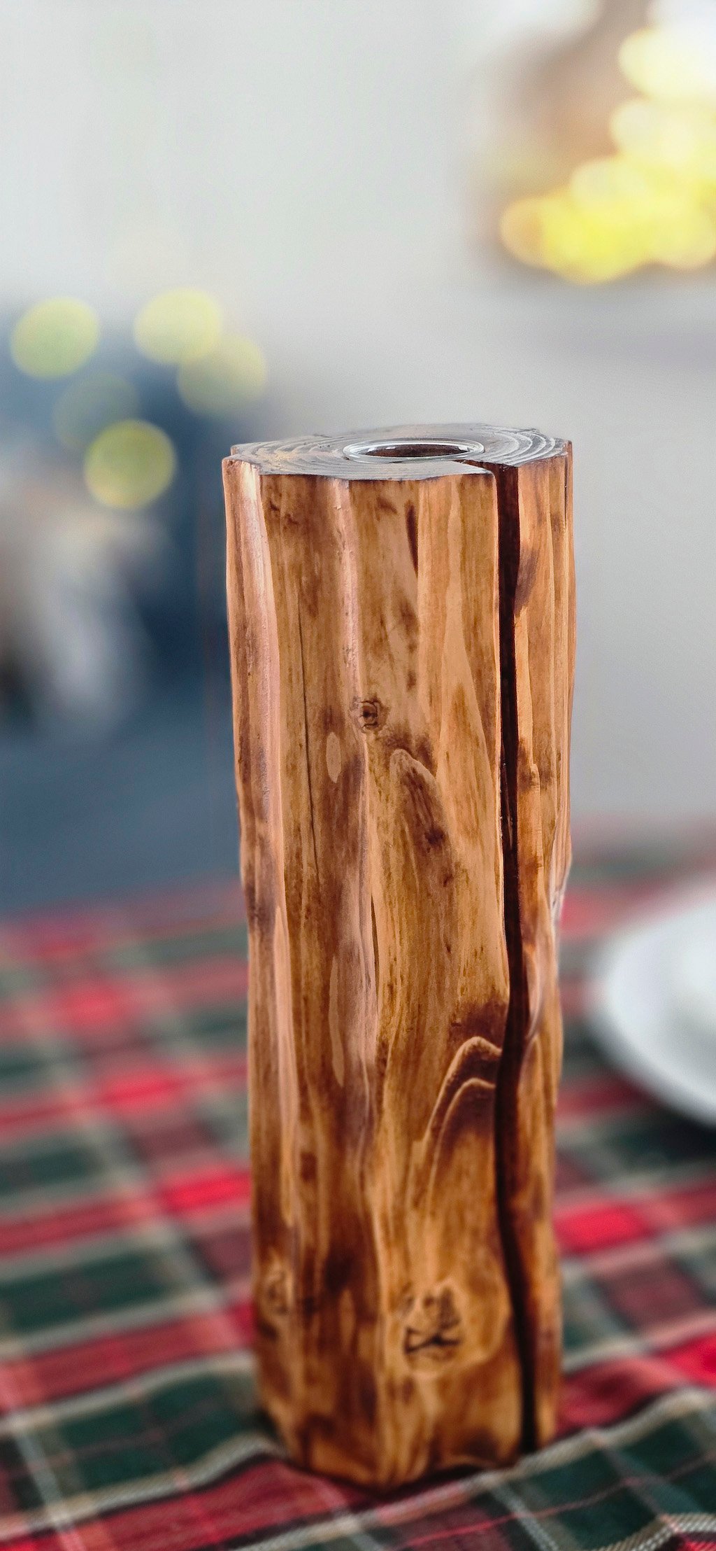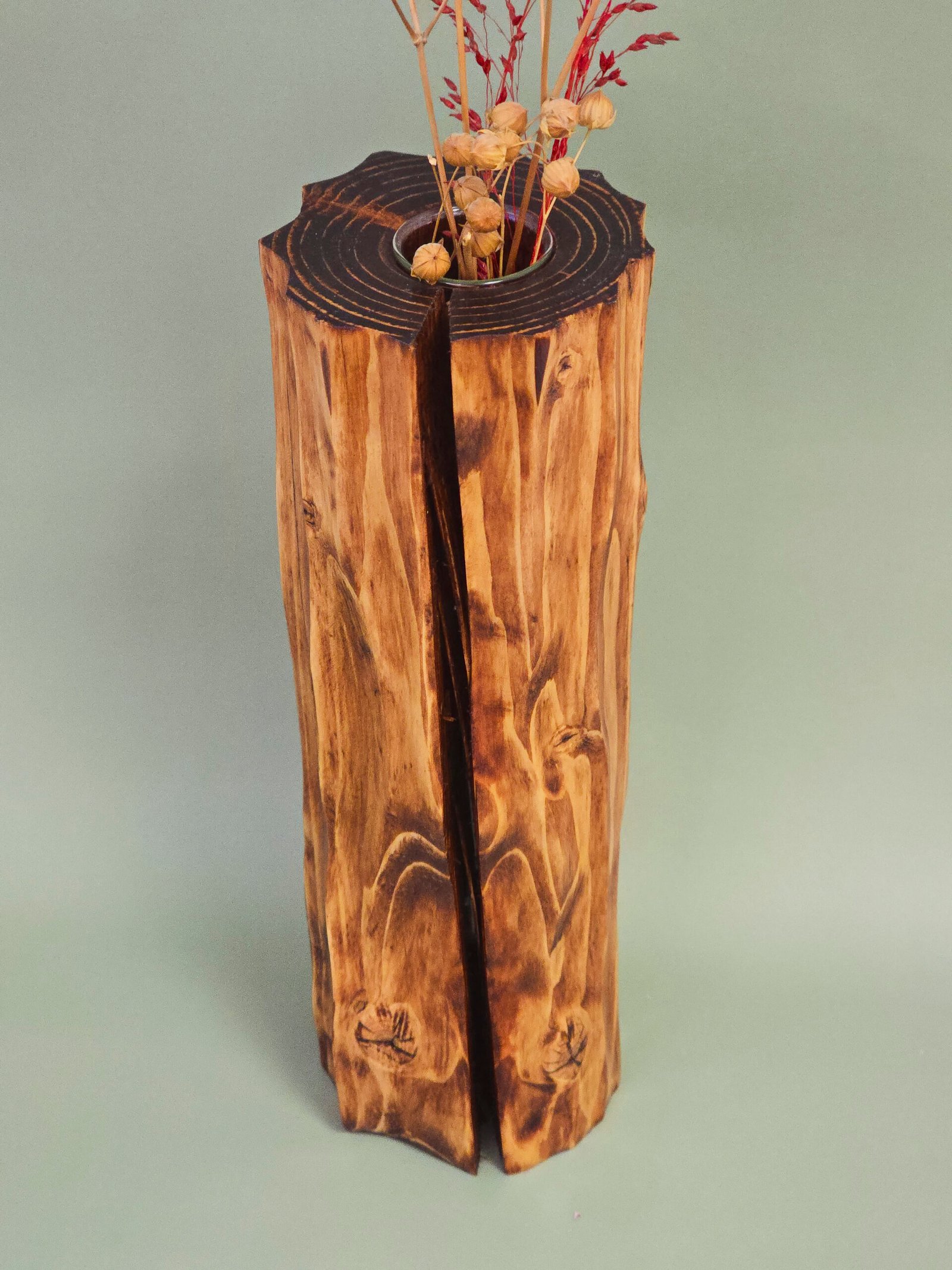 Rankų darbo medžio masyvo vaza su stikline kolba. Masyvi, natūralių medžio įskylimų turinti bei pailgos formos vaza. Vertikalios apdirbtos rievės išryškina itin nuostabų medžio gijų raštą.