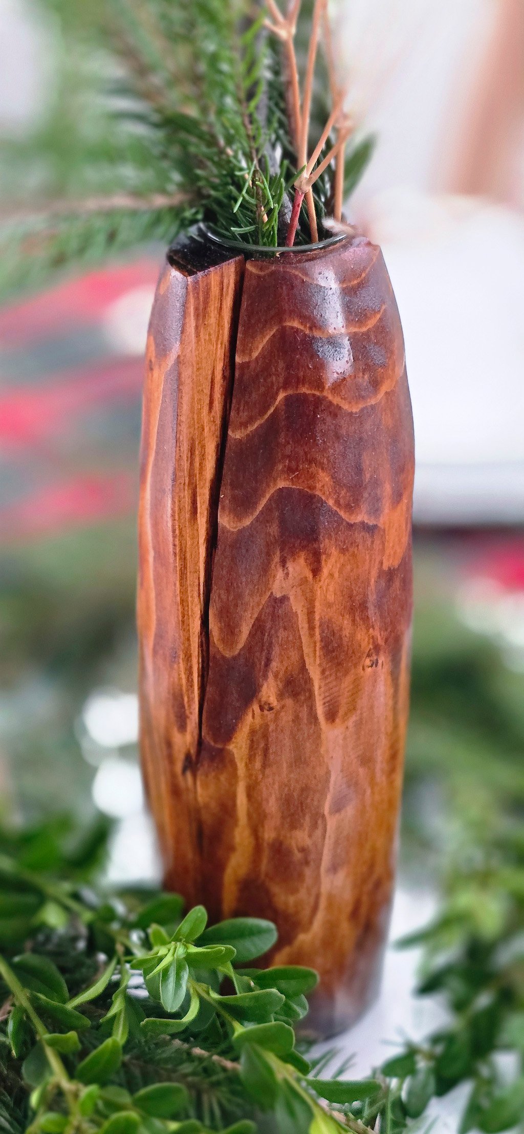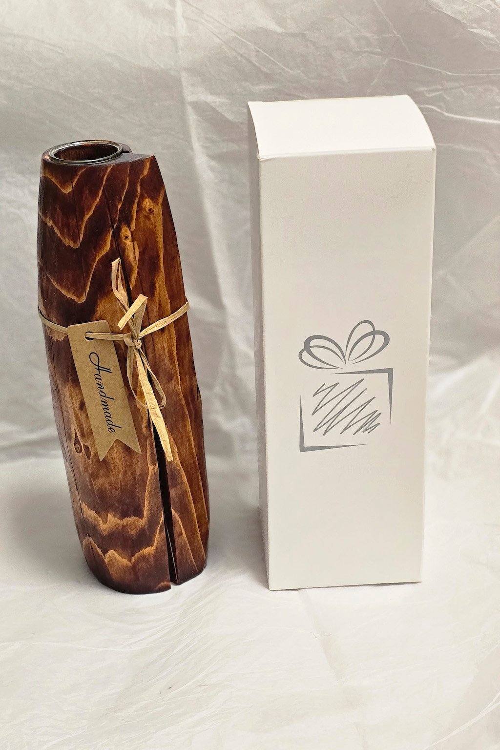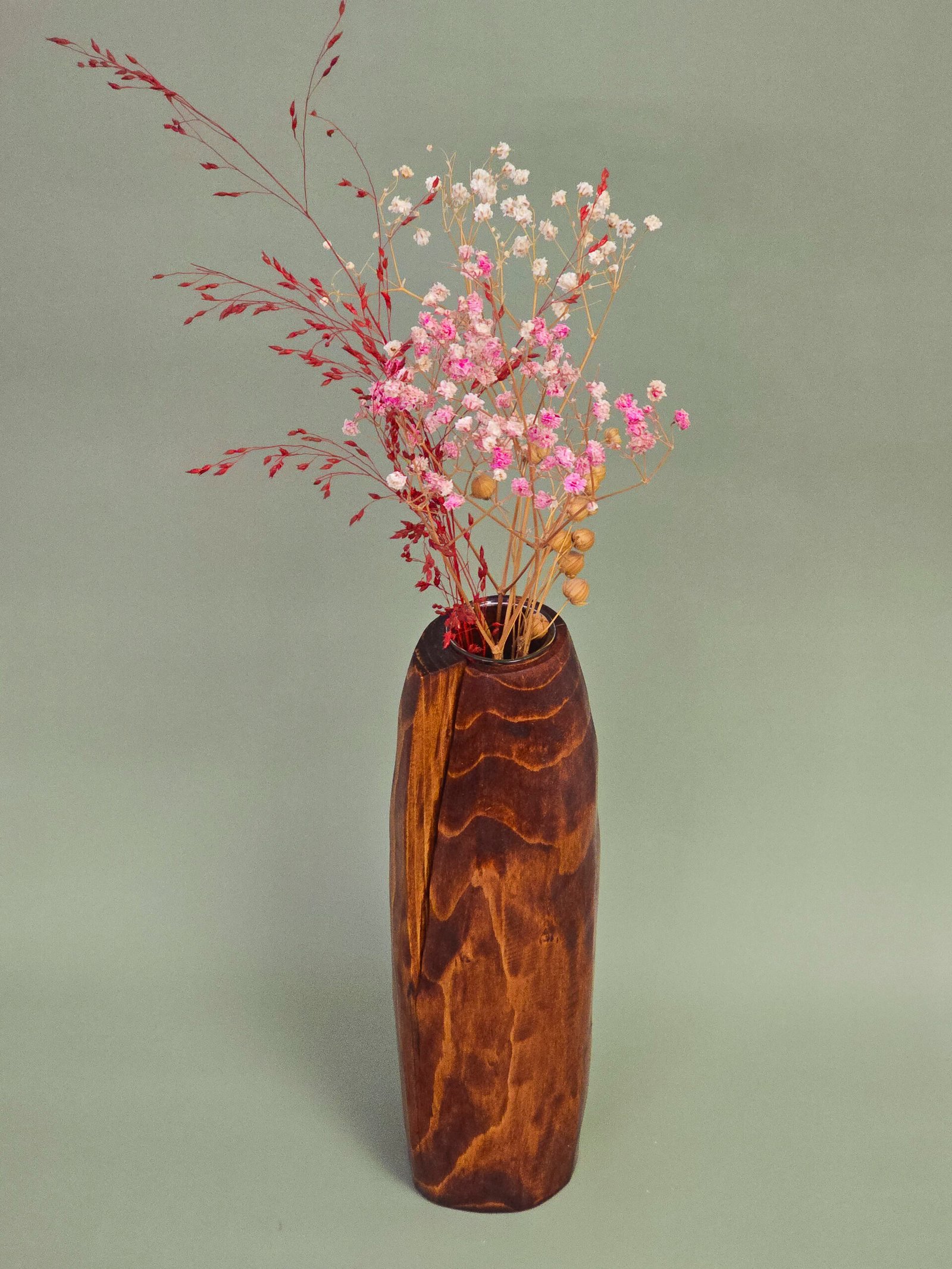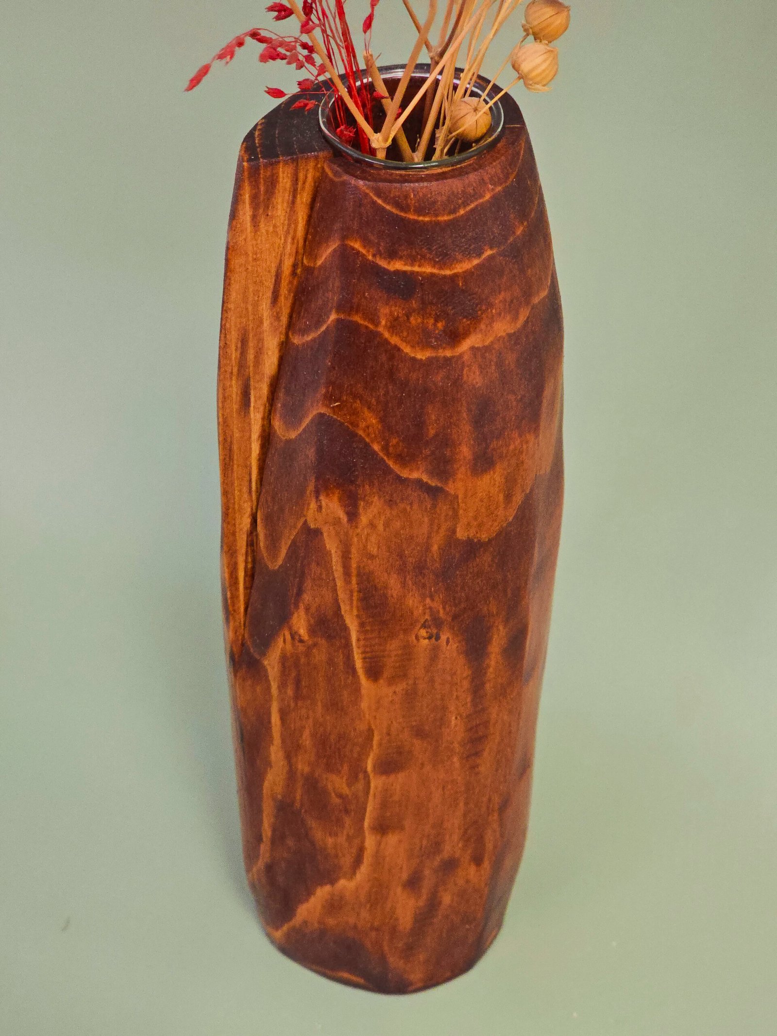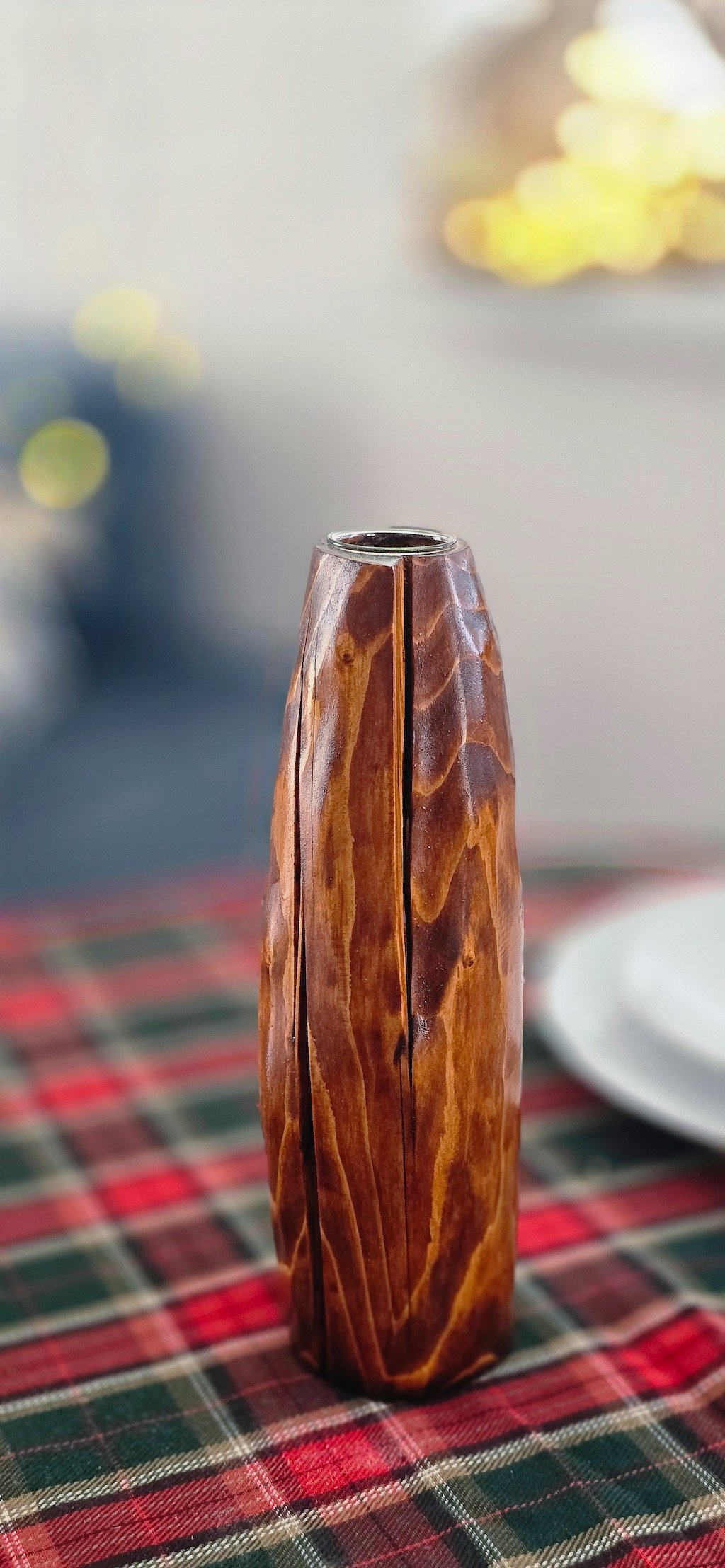 Rankų darbo medžio masyvo vaza su stikline kolba. Masyvi, natūralių medžio įskylimų turinti vaza. Apdirbimas išryškina itin nuostabų medžio gijų raštą.