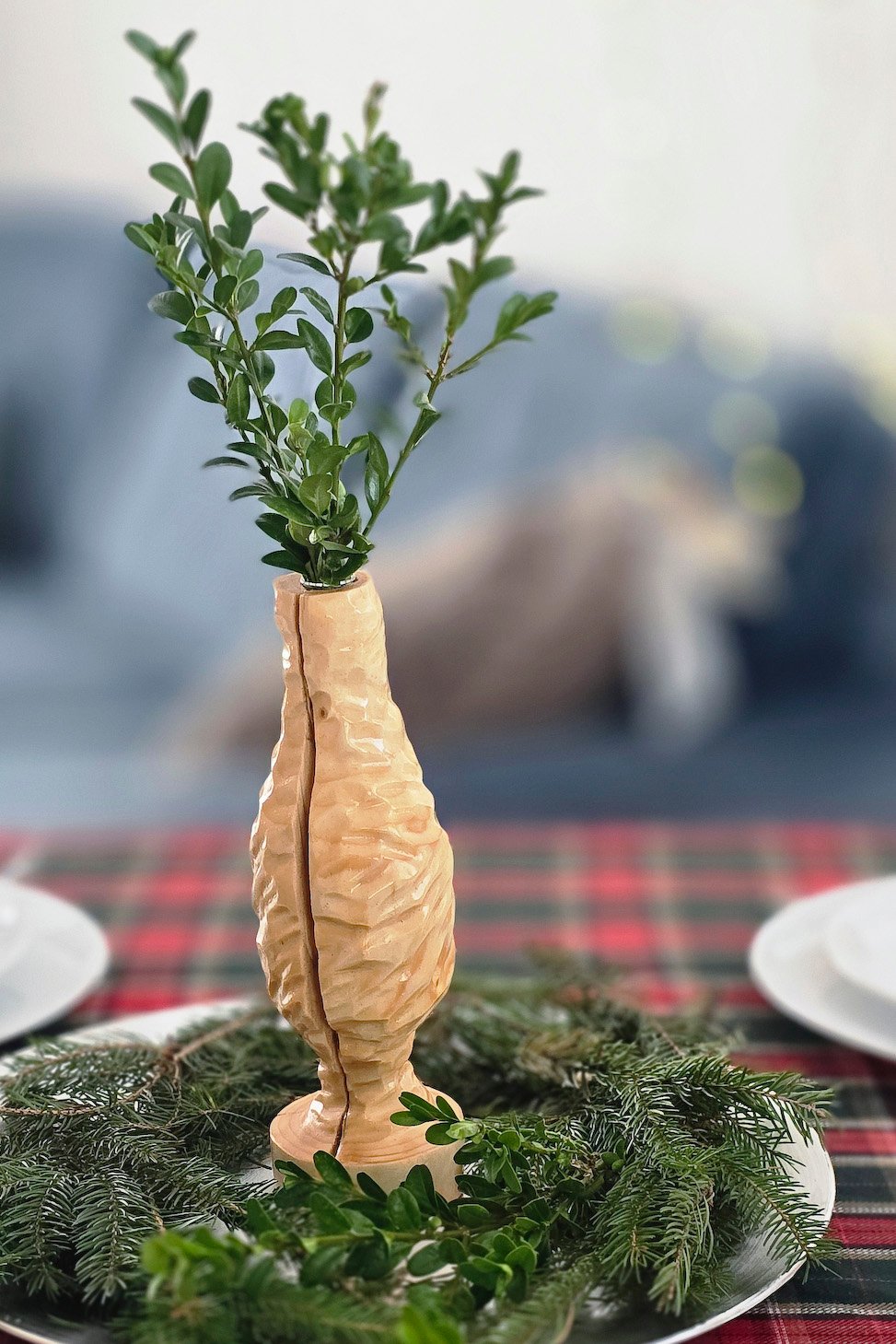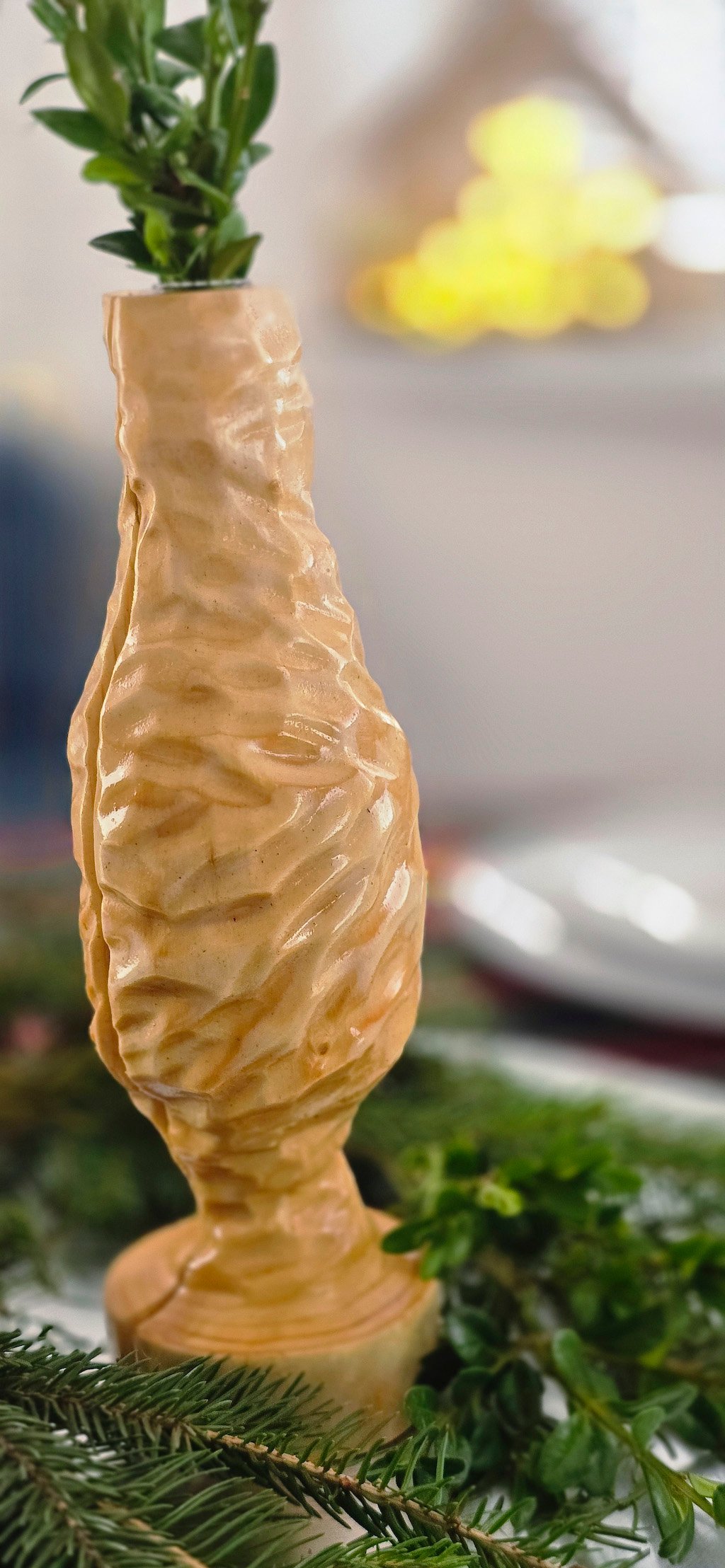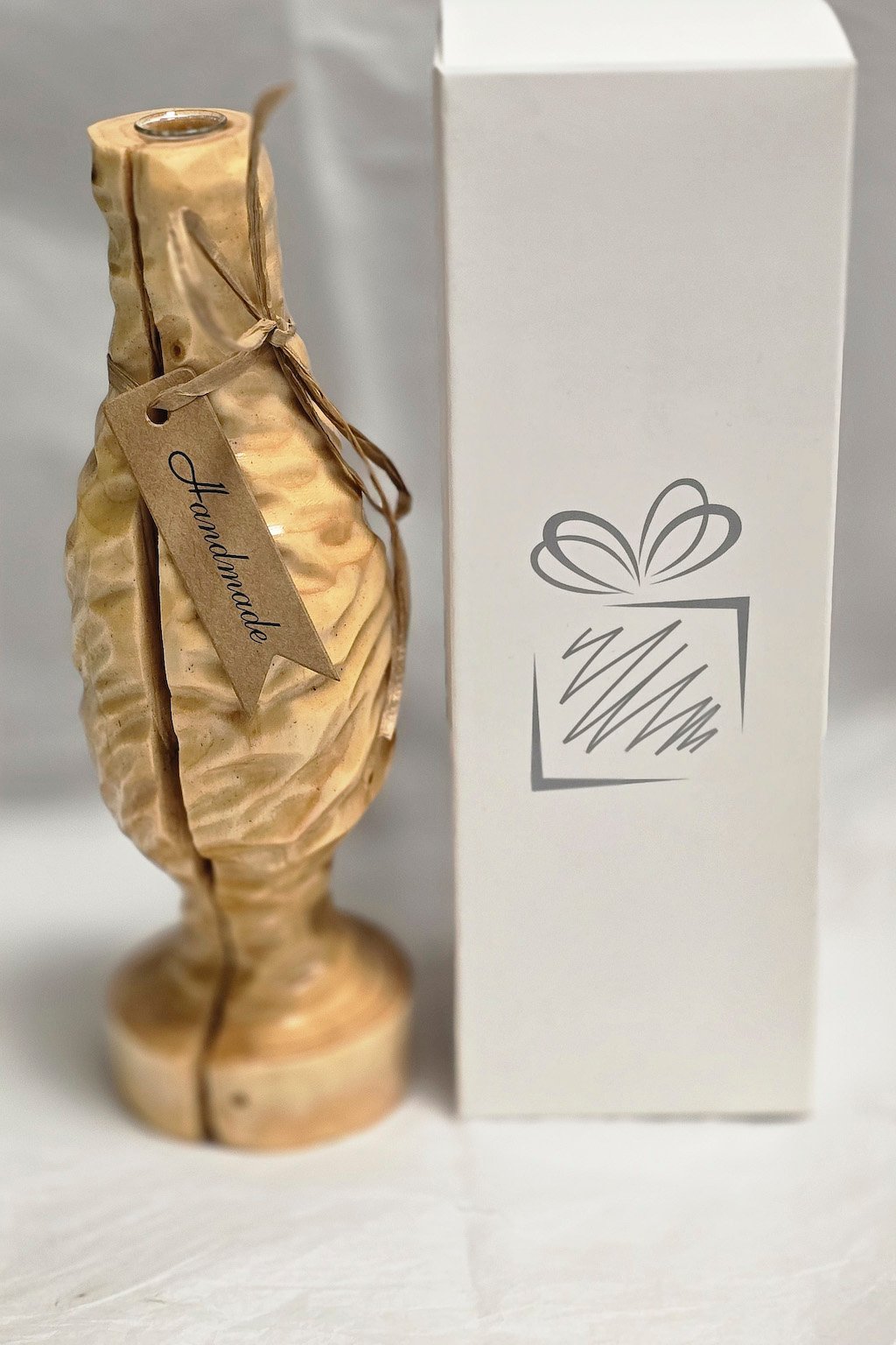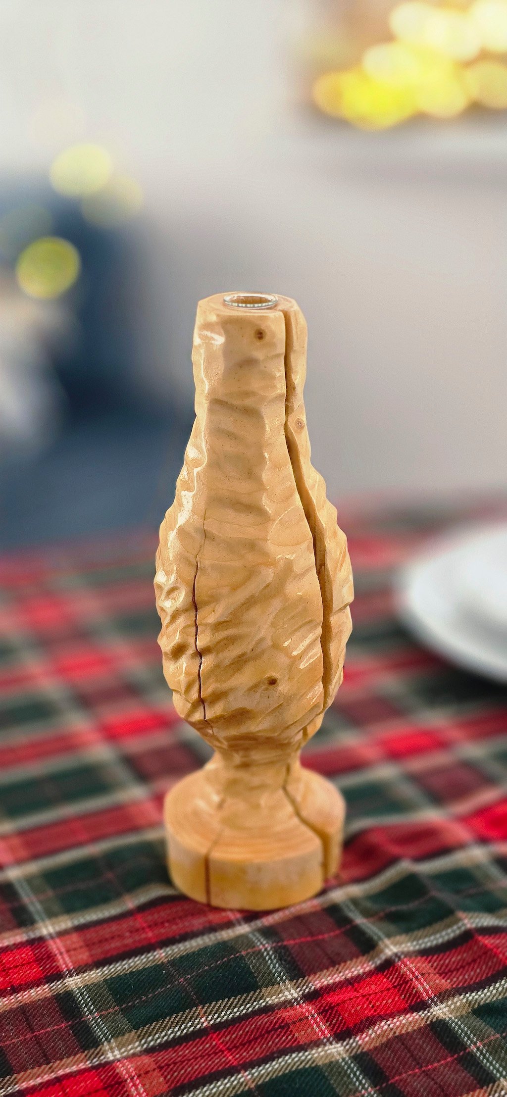 Rankų darbo medžio masyvo vaza su stikline kolba. Nedidelė, kompaktiška vaza, tačiau išskirtinai į save atkreipiantis dėmesį interjero akcentas.